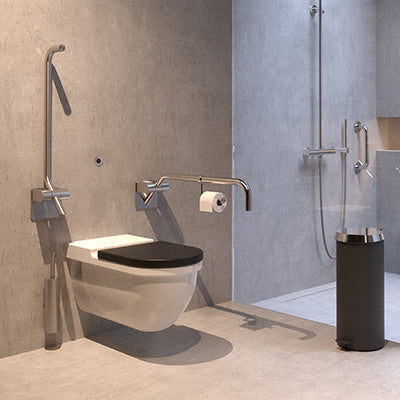Klappbarer Duschsitz 1963 von Frost Denmark in Edelstahl poliert – eleganter Wandklappsitz für barrierefreie Bäder in Hotellerie und Pflege.Klappbarer Duschsitz NOVA2 CARE 1963