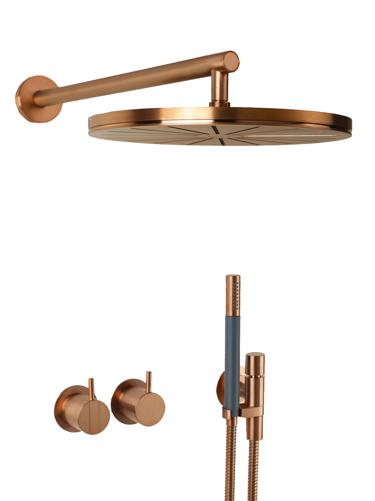 Exemple : Vola 5471R-061, robinet de douche avec pomme de pluie, douchette à main, poignée thermostatique, poignée de commande et inverseur.